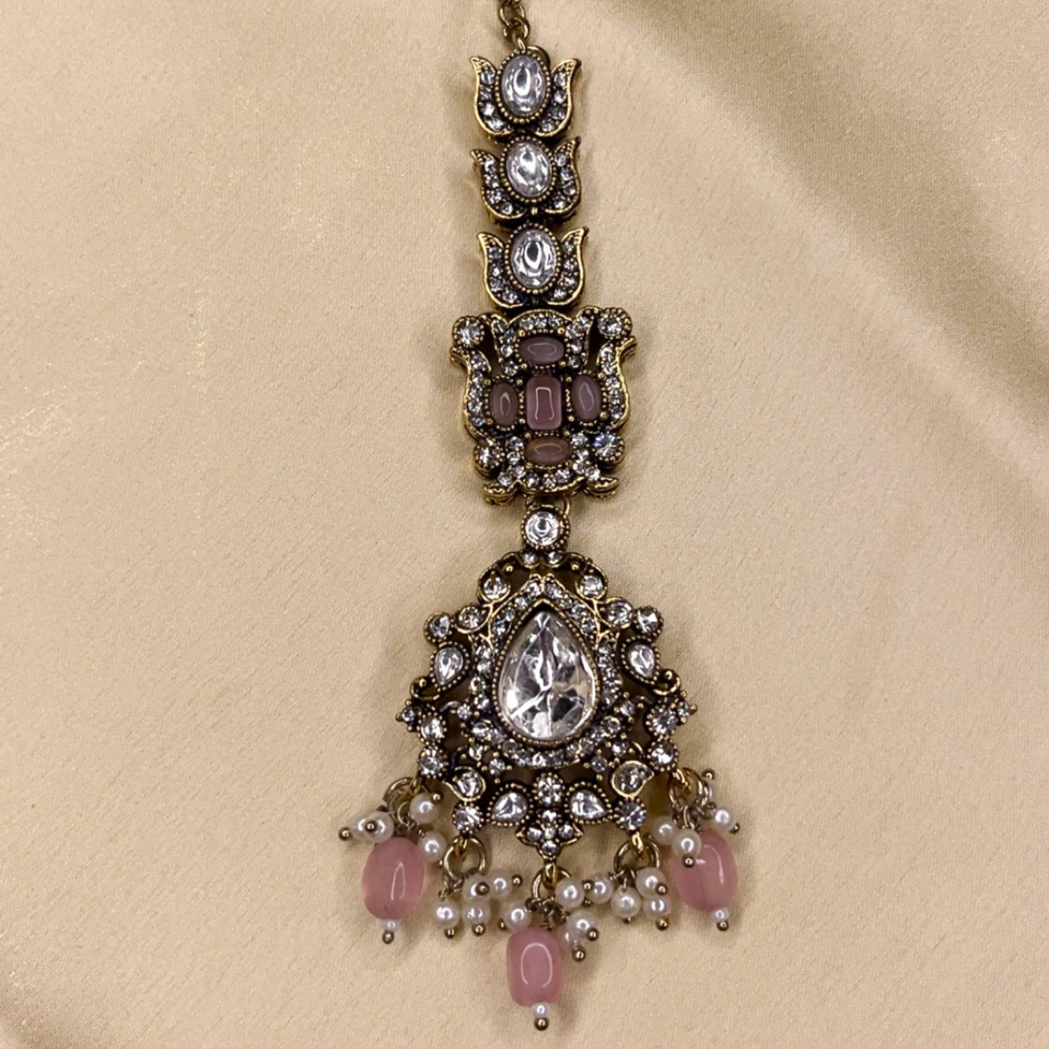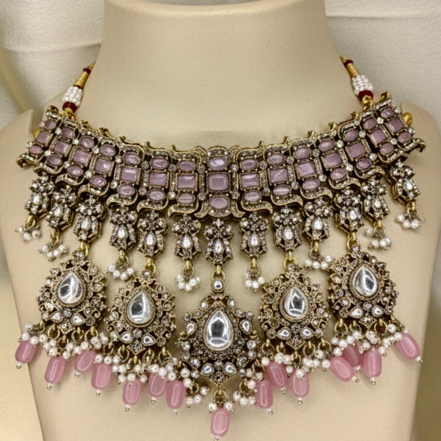 A statement of timeless royalty, the Noor Kundan Necklace is exquisitely handcrafted to celebrate traditional Indian artistry. his necklace is adorned with shimmering crystal accents and graceful pearl clusters. The lower edge showcases elegant teardrop motifs with mirror-cut stones, finished with delicate bead drops that add movement and charm.