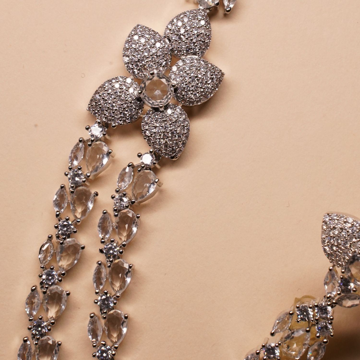 This jewellery set features silver-toned, crystal-studded floral drop earrings paired with a matching double-layer necklace. Elegant and sparkling, it’s perfect for special occasions and festive wear.